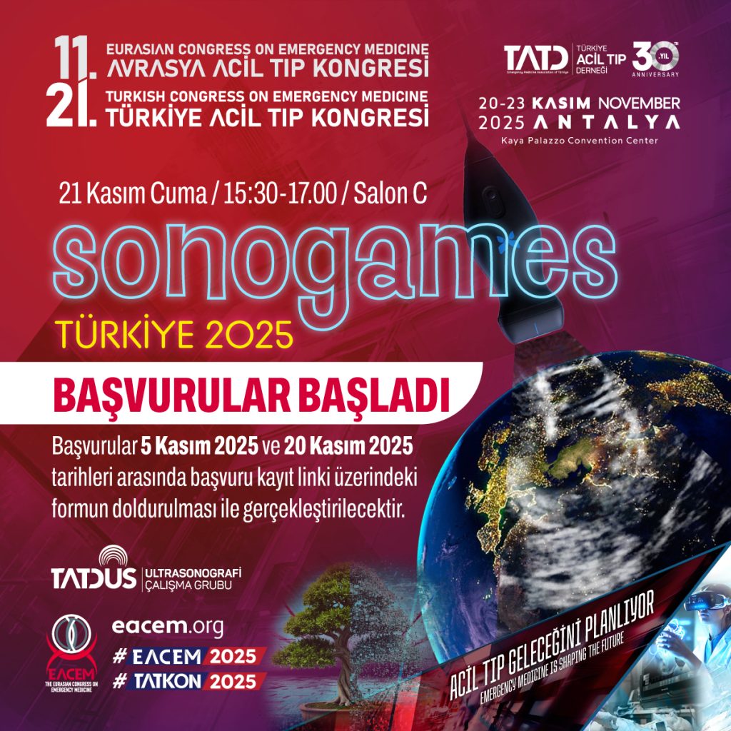 Türkiye Acil Tıp Derneği Ultrasonografi Çalışma Grubu (TATDUS) tarafından ilki 2016 yılında düzenlenen Ultrasonografi Yarışmamız Akademik Acil Tıp Derneği’nin (SAEM) sonraki yıllarda yarışmamıza ilgisi ile SONOGAMES Türkiye adı altında her yıl geleneksel olarak düzenlenmeye başlandı. Acil Tıp Asistanlarını bir araya getiren kritik hastada ultrasonografi becerilerini eğlenerek öğrenmeye teşvik eden yarışmada bu yıl “Acil Servisler Geleceğini Planlıyor” mottosu ile sizlerle buluşmak için sabırsızlanıyoruz. Nefesleri kesecek, izleyenleri de yarışanları da heyecanın doruklarına yükseltecek “Sonogames Türkiye 2025” sürpriz etaplarının hazırlıkları tamamlandı ve artık yarışmacı olarak başvurularınızı bekliyoruz.